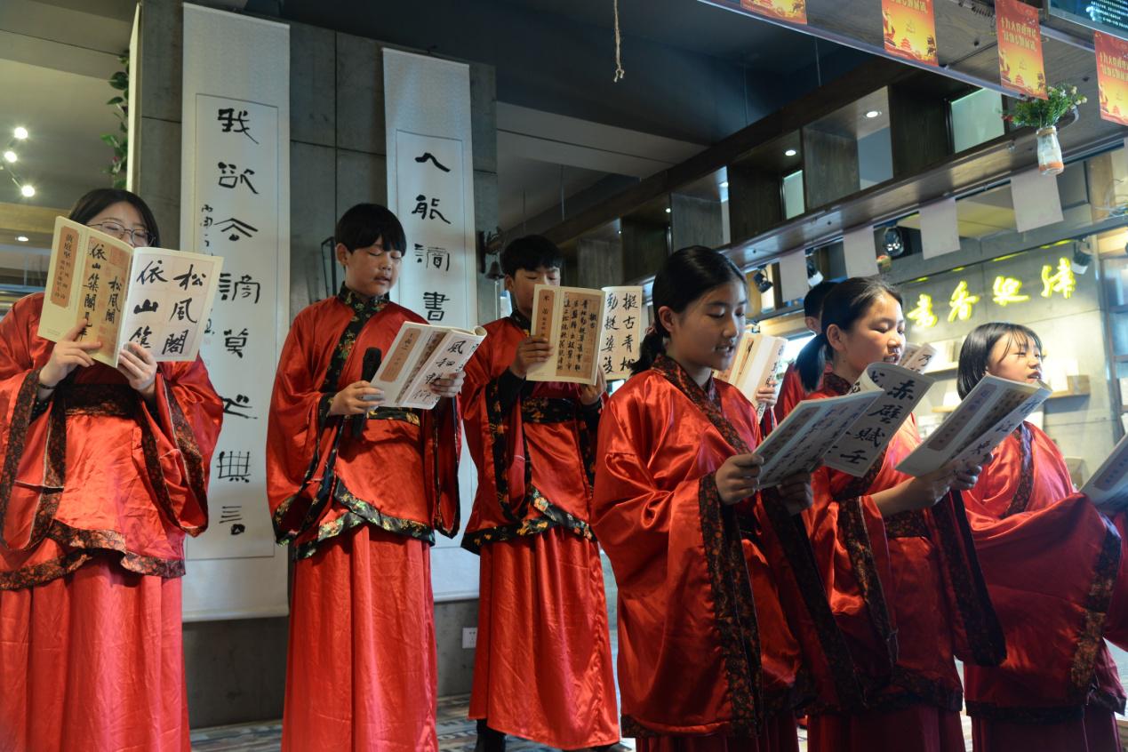 國學(xué)經(jīng)典誦讀《<論語>十二章》是來自玉成中學(xué)的學(xué)生,他們身著漢服,手執(zhí)經(jīng)書娓娓吟誦。
