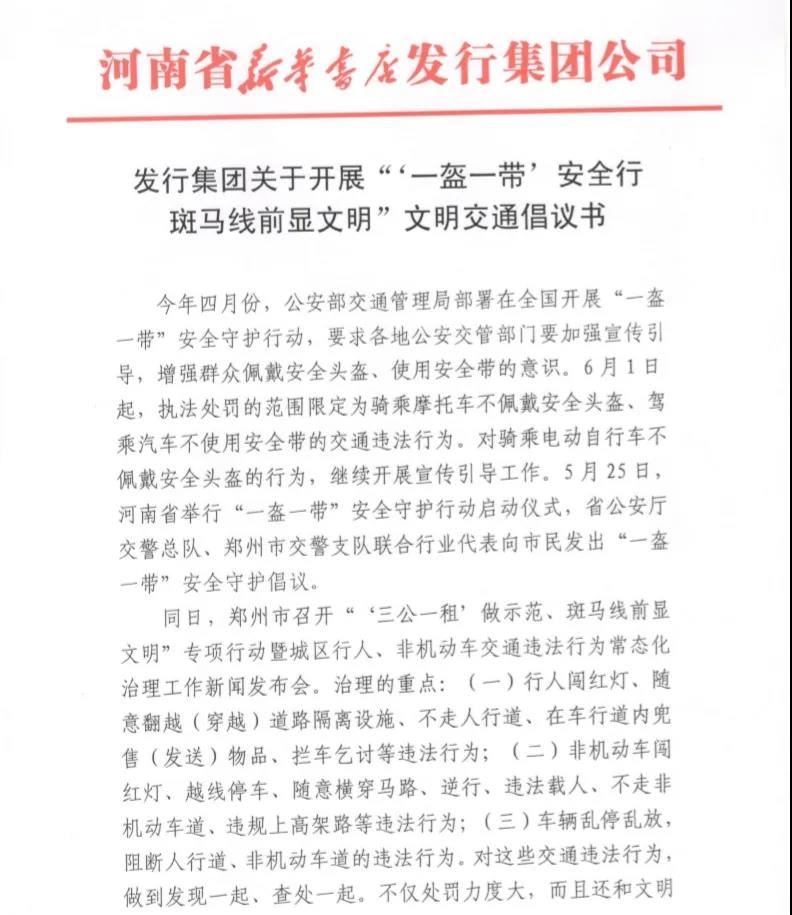 6月初,為響應(yīng)公安部交管局、河南省和鄭州市交通部門關(guān)于“一盔一帶”安全守護(hù)倡議,發(fā)行集團(tuán)發(fā)出了《關(guān)于開展“‘一盔一帶’安全行 斑馬線前顯文明”文明交通倡議書》,一如既往積極響應(yīng)并支持配合上級(jí)部門的號(hào)召和工作要求,用實(shí)際行動(dòng),影響和帶動(dòng)全社會(huì)廣大交通參與者不斷強(qiáng)化禮讓斑馬線、文明過(guò)馬路的意識(shí)。