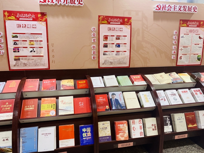 通過布置紅色書籍展臺,設(shè)置黨史學(xué)習(xí)教育系列讀物展示專區(qū),黨史類書籍達(dá)一千多種。第一時間重點(diǎn)宣傳陳列了《論中國共產(chǎn)黨歷史》等重點(diǎn)學(xué)習(xí)讀物,并設(shè)立了中國共產(chǎn)黨史、新中國史等“四史”圖書的專題展區(qū)。