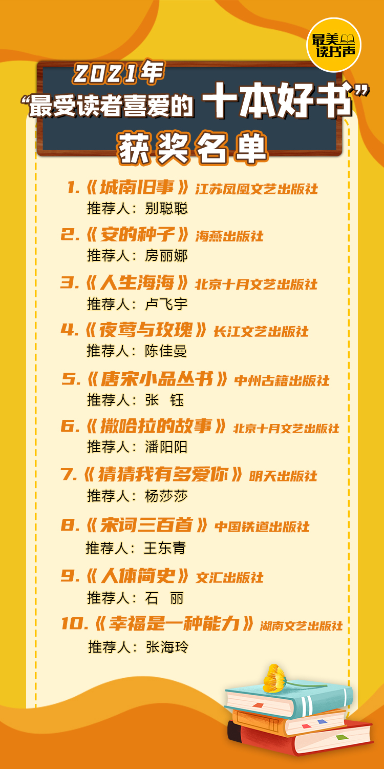 經過激烈的角逐,由選手別聰聰推薦的《城南舊事》、選手房麗娜推薦的《安的種子》、選手盧飛宇推薦的《人生海海》、選手陳佳曼推薦的《夜鶯與玫瑰》、選手張鈺推薦的《唐宋小品叢書》、選手潘陽陽推薦的《撒哈拉的故事》、選手楊莎莎推薦的《猜猜我有多愛你》、選手王東青推薦的《宋詞三百首》、選手石麗推薦的《人體簡史》、選手張海玲推薦的《幸福是一種能力》10本圖書榮獲“2021年度最受讀者喜愛的10本好書”。