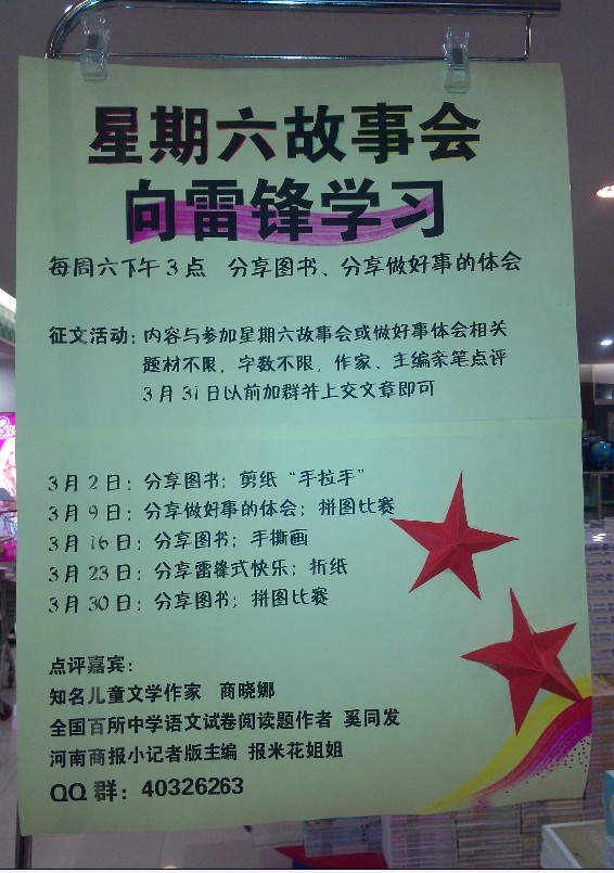 伴隨著春節(jié)長(zhǎng)假的遠(yuǎn)去,三月份如期而至,同時(shí)該月又是學(xué)雷鋒月,鄭州市店為大力弘揚(yáng)雷鋒精神,充分利用自身營(yíng)銷品牌——“星期六故事會(huì)”這一平臺(tái),開展為期一個(gè)月的“向雷鋒學(xué)習(xí)”主題活動(dòng)。