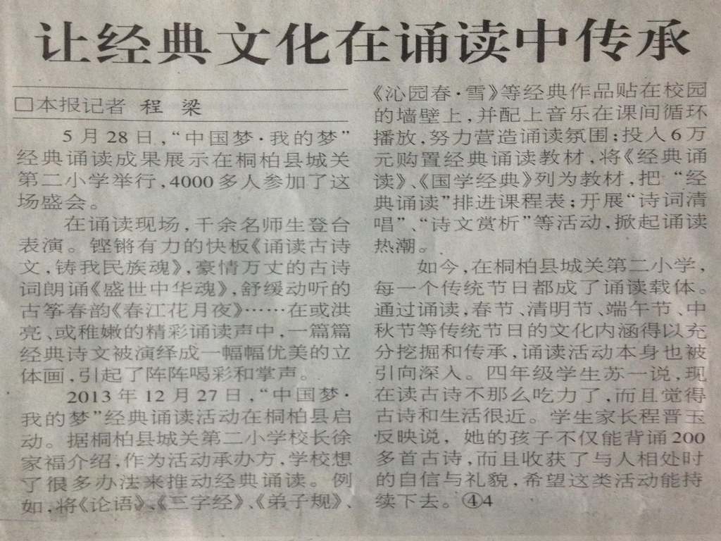 2013年12月27日,桐柏縣“中國夢(mèng)·我的夢(mèng)”經(jīng)典誦讀活動(dòng)啟動(dòng)。此次經(jīng)典誦讀活動(dòng)以桐柏縣店店校聯(lián)辦讀者俱樂部為平臺(tái),以了解中國傳統(tǒng)文化、汲取民族智慧為出發(fā)點(diǎn),進(jìn)一步豐富完善讀者俱樂部的服務(wù)功能,使之真正成為“未成年人思想道德建設(shè)教育基地”。日前,桐柏縣“中國夢(mèng)·我的夢(mèng)”經(jīng)典誦讀成果展示活動(dòng)在城關(guān)二小舉辦。在誦讀展演中,豐富的表現(xiàn)形式,加上孩子們精彩的誦讀,飽滿的熱情,高昂的激情,充分展現(xiàn)了古詩文朗誦的藝術(shù)感染力和舞臺(tái)表現(xiàn)力,展現(xiàn)了中華經(jīng)典穿越時(shí)空的恒久魅力。