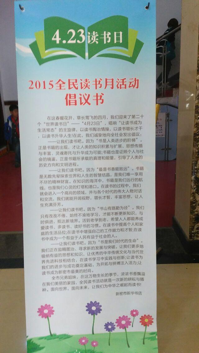 為更好營造書香社會,促進(jìn)社會閱讀風(fēng)尚的形成,提升民族文化素質(zhì),推進(jìn)學(xué)習(xí)型城市建設(shè),提高我店綜合收益,在4月23日世界讀書日來臨之際,新密市新華書店發(fā)出了2015年全民讀書月活動倡議書,提出了“美麗四月天,相約讀書日”閱讀主題,全力搞好宣傳,確;顒尤〉脤(shí)效,該店利用電子顯示屏、張貼海報、賣場布置等手段進(jìn)行宣傳,營造氛圍,并積極組織開展流動售書活。