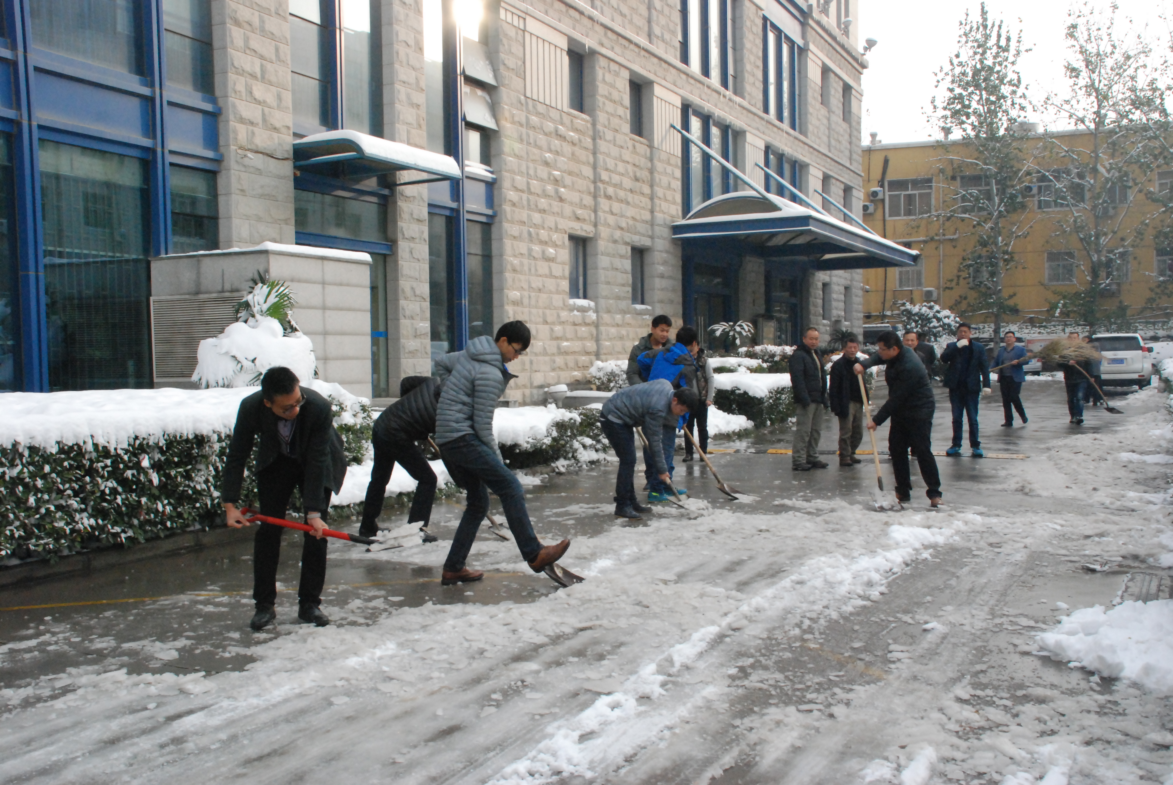 11月22日,大雪席卷鄭州,形成較厚積雪,帶來出行不便。第二日清晨,發(fā)行集團(tuán)領(lǐng)導(dǎo)和各部室員工克服交通困難,早早趕來,鏟冰掃雪,及時(shí)清障,確保了公司院內(nèi)道路通暢。