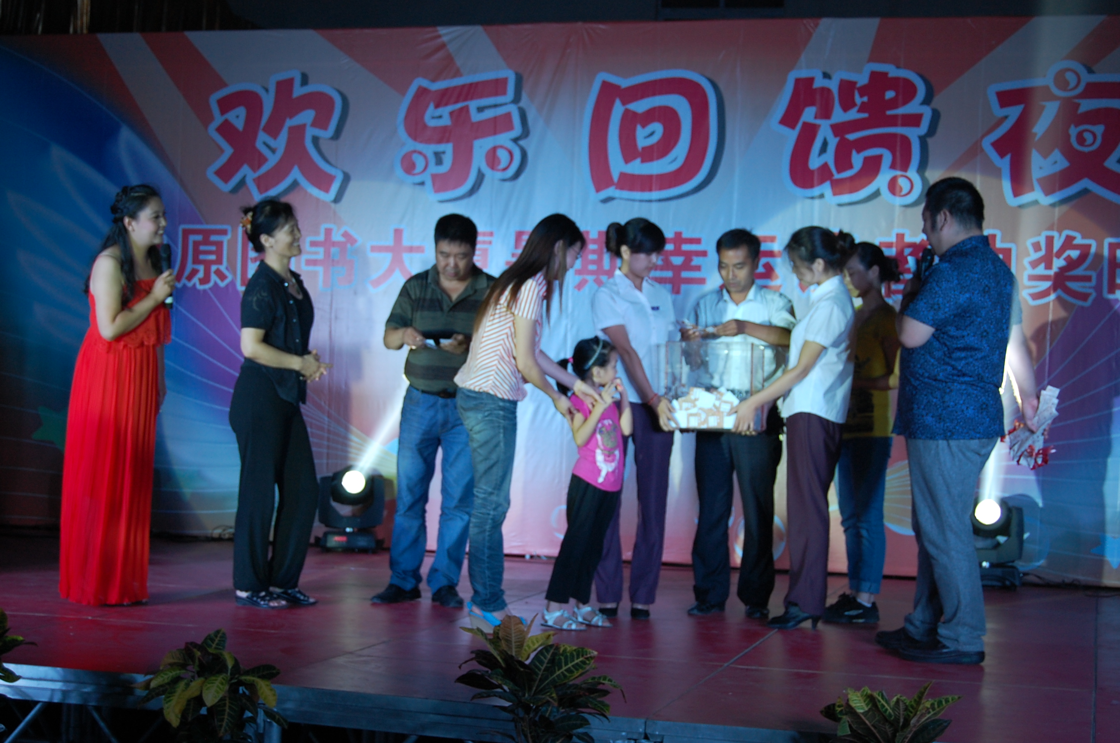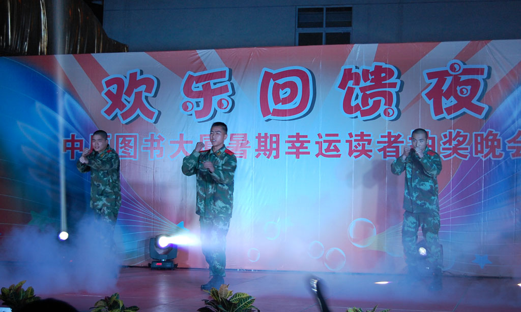 晚上,發(fā)行集團員工同軍民共建合作單位武警鄭州支隊的戰(zhàn)士們一起為讀者奉獻(xiàn)出一臺富有激情的精彩晚會。街舞、獨唱、傣族舞、軍民對唱等一個個節(jié)目美不勝收,最后,武警戰(zhàn)士表演的團體操擒拿格斗和發(fā)行集團精心編排的合唱節(jié)目《紅旗頌》、《青春舞曲》、《愛我中華》等獲得現(xiàn)場觀眾最熱烈的掌聲,將整場晚會推向高潮,完美展現(xiàn)了軍民一家親的深厚情誼和發(fā)行集團職工絢爛多姿的亮麗風(fēng)采。為回饋廣大讀者,中原圖書大廈推出了為期兩個月的《快樂暑期,幸運連軸轉(zhuǎn)》抽獎活動,本次晚會在文藝表演過程中穿插抽獎內(nèi)容,出席晚會的領(lǐng)導(dǎo)和嘉賓,現(xiàn)場為獲獎讀者頒發(fā)獎品。