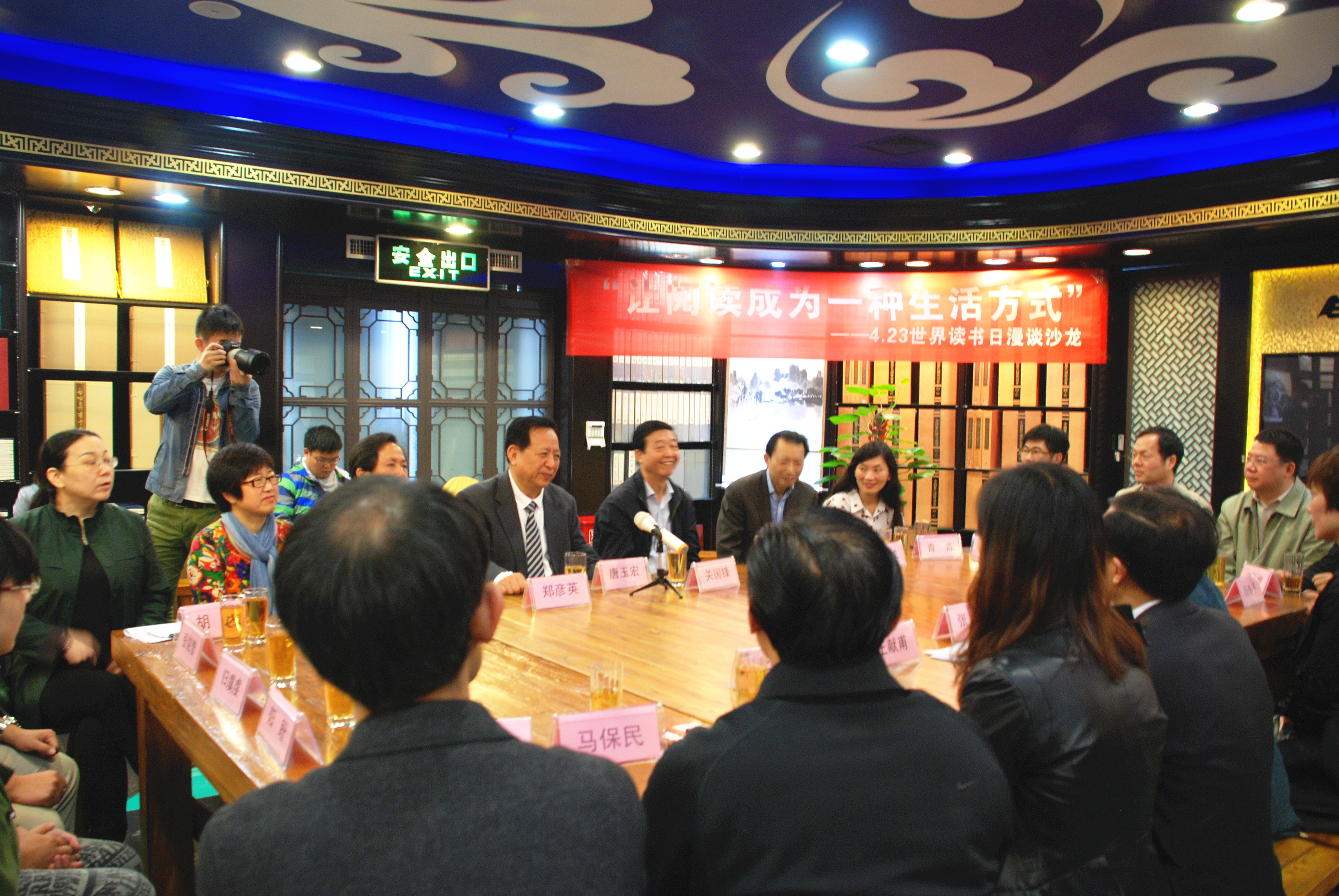 啟動儀式后,省社科聯(lián)、省文聯(lián)、省作協(xié)、省文學(xué)院、省詩歌學(xué)會等知名專家、學(xué)者;教育界、學(xué)校師生、讀者代表;新聞出版界,中央及省內(nèi)各大媒體50余人,共同出席主題為“書香中原:讓閱讀成為一種生活方式”的漫談沙龍。各位嘉賓圍繞“全民閱讀”、“圖書與文化”“文化與生活”等話題,在書香、茶香中暢所欲言。